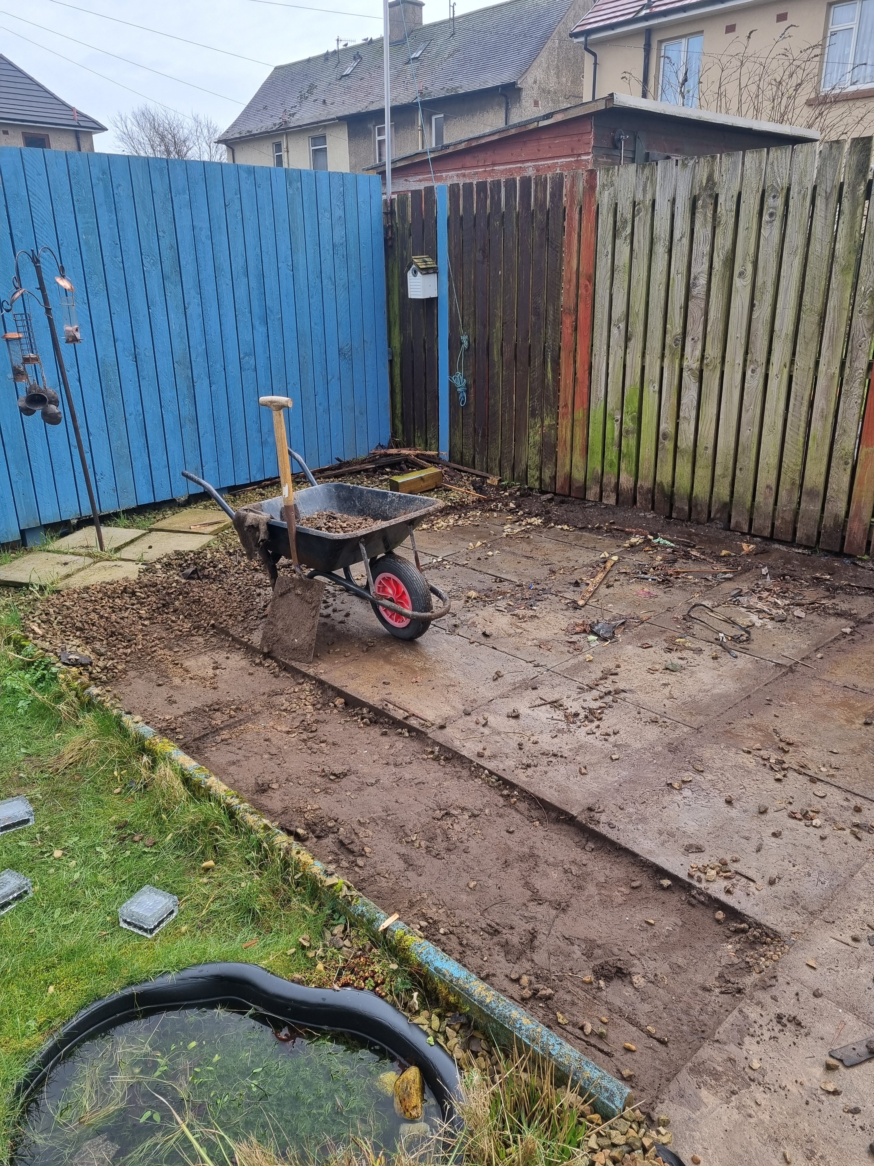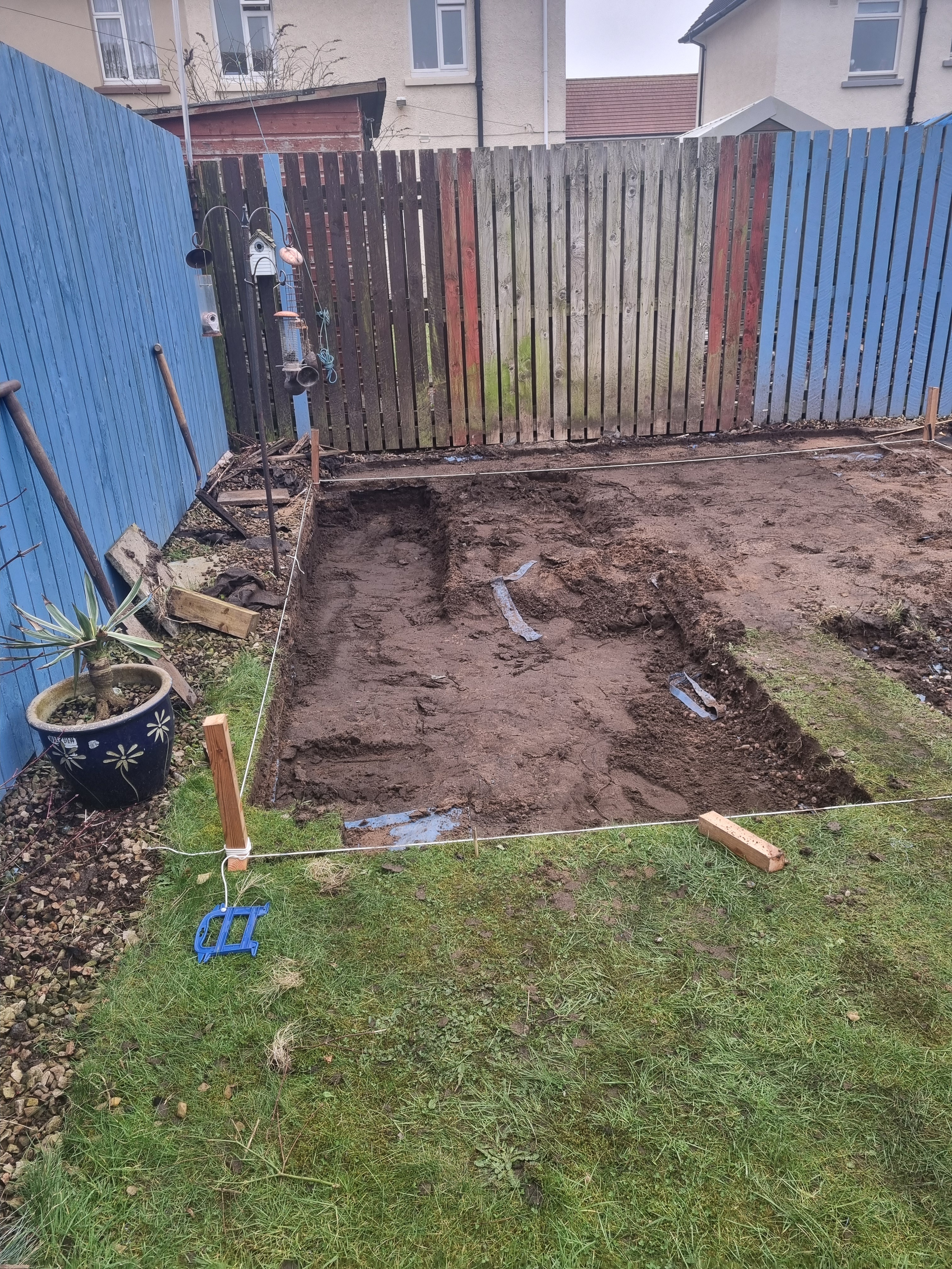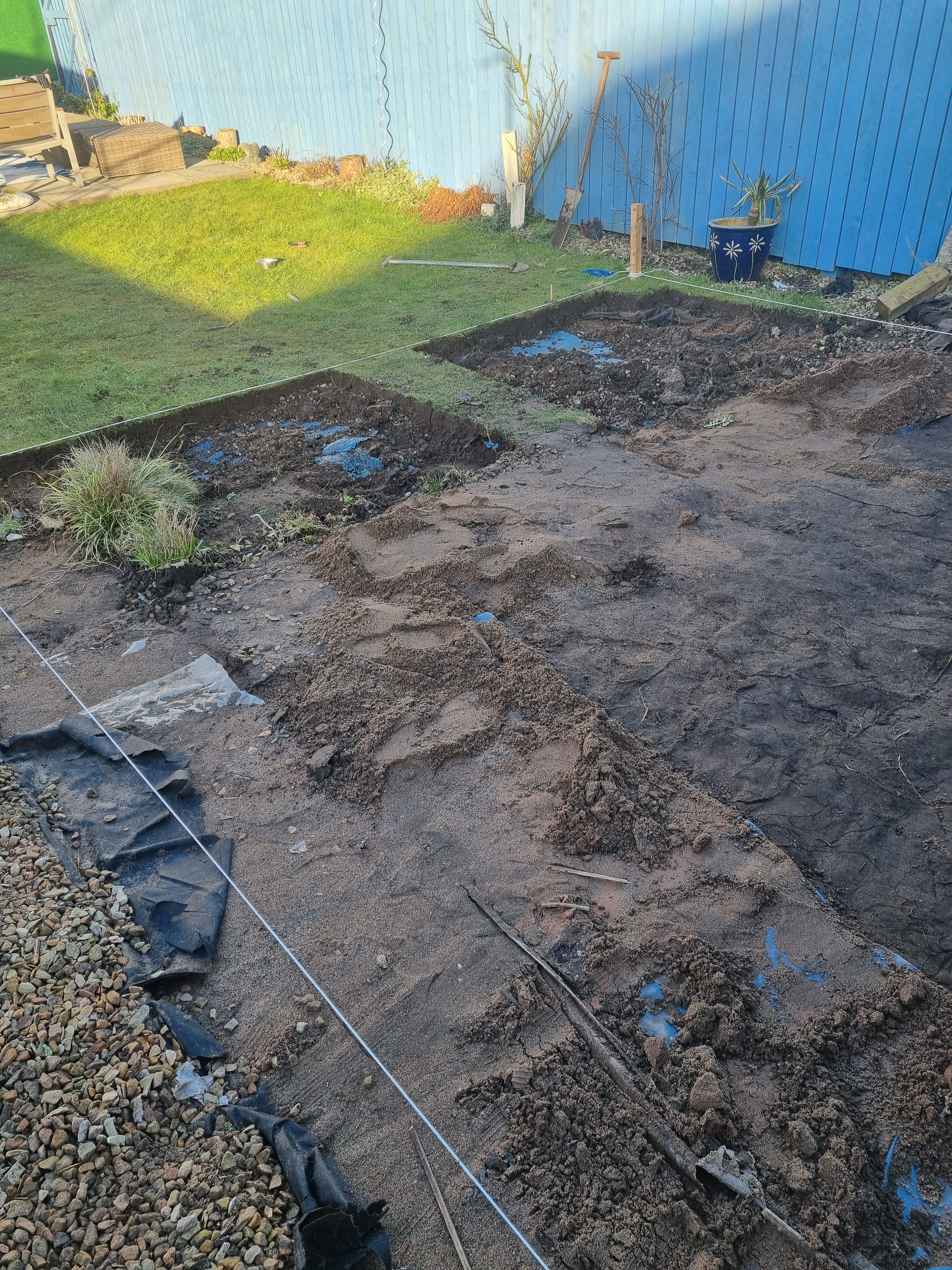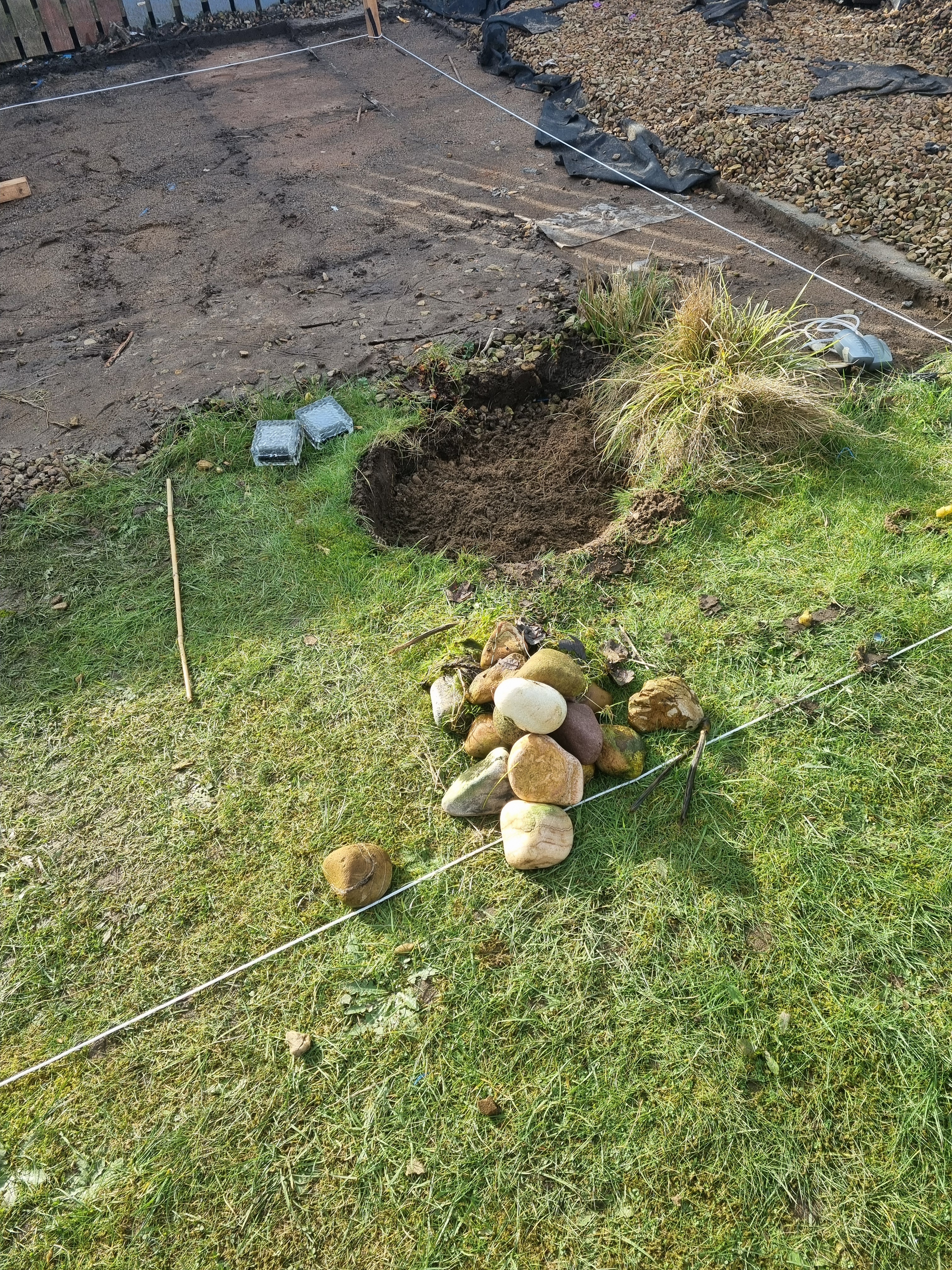 Pond moved to it's new home and foundation digging underway. Plenty of help from Wendy today as it's the weekend...