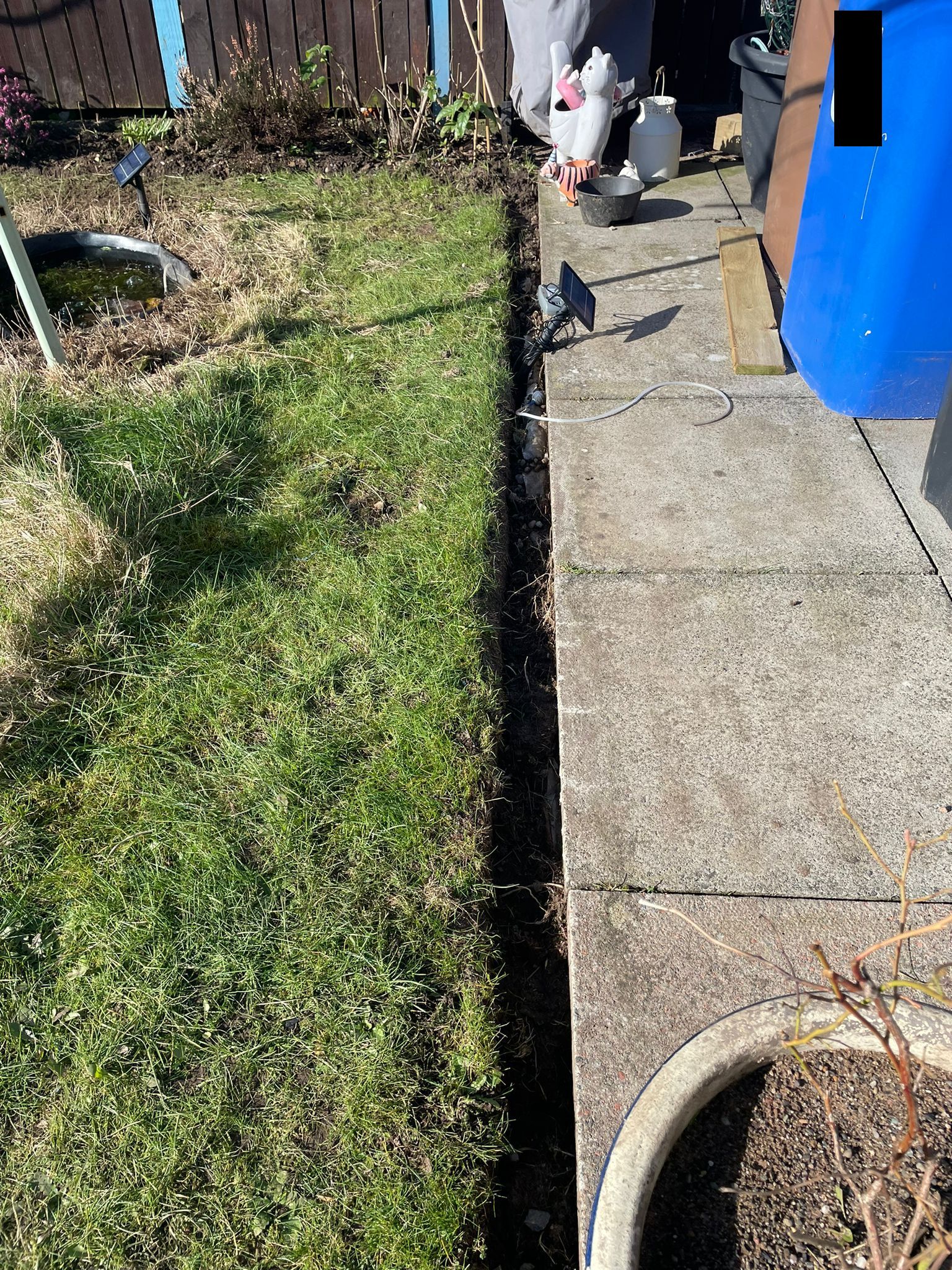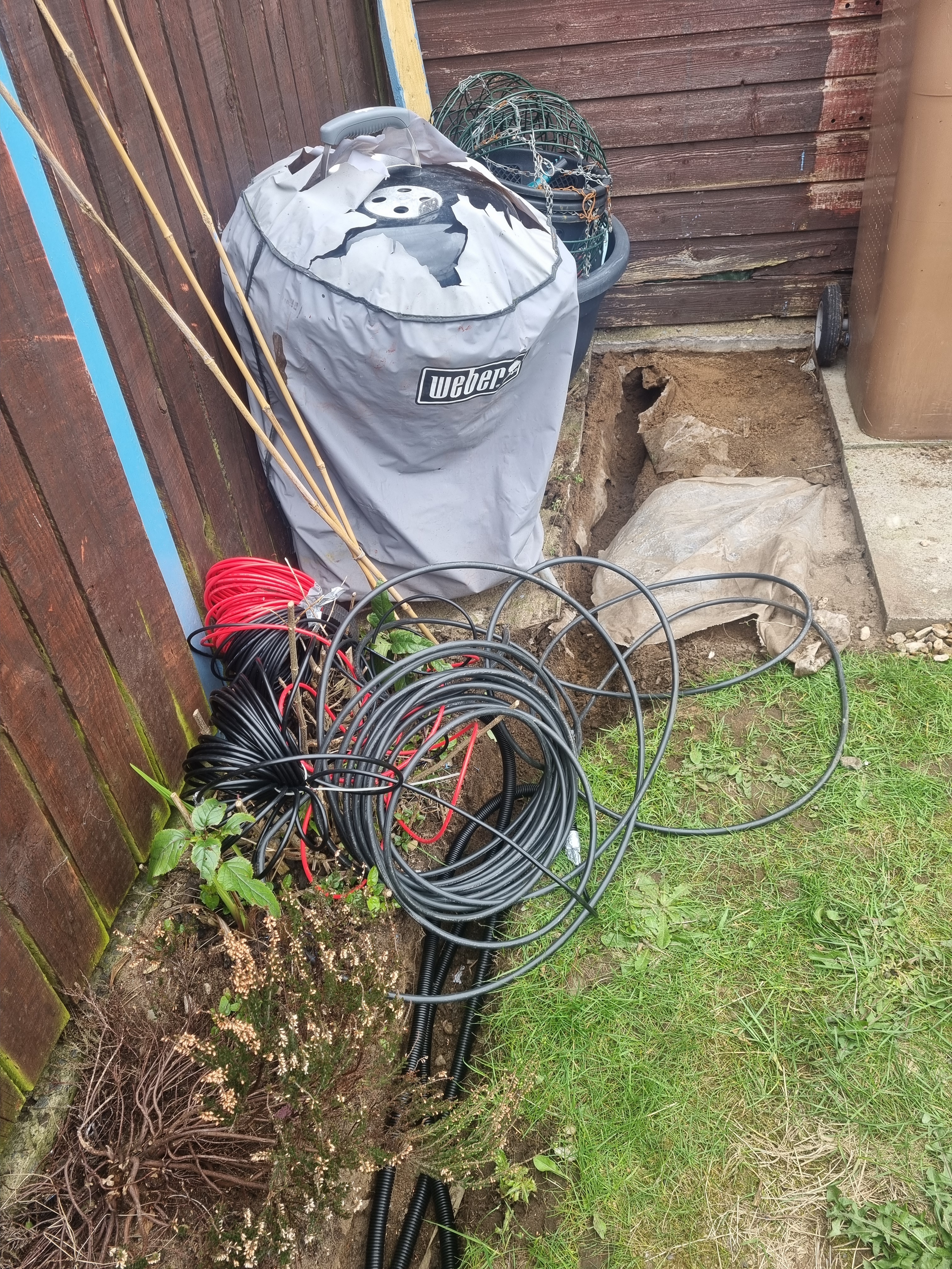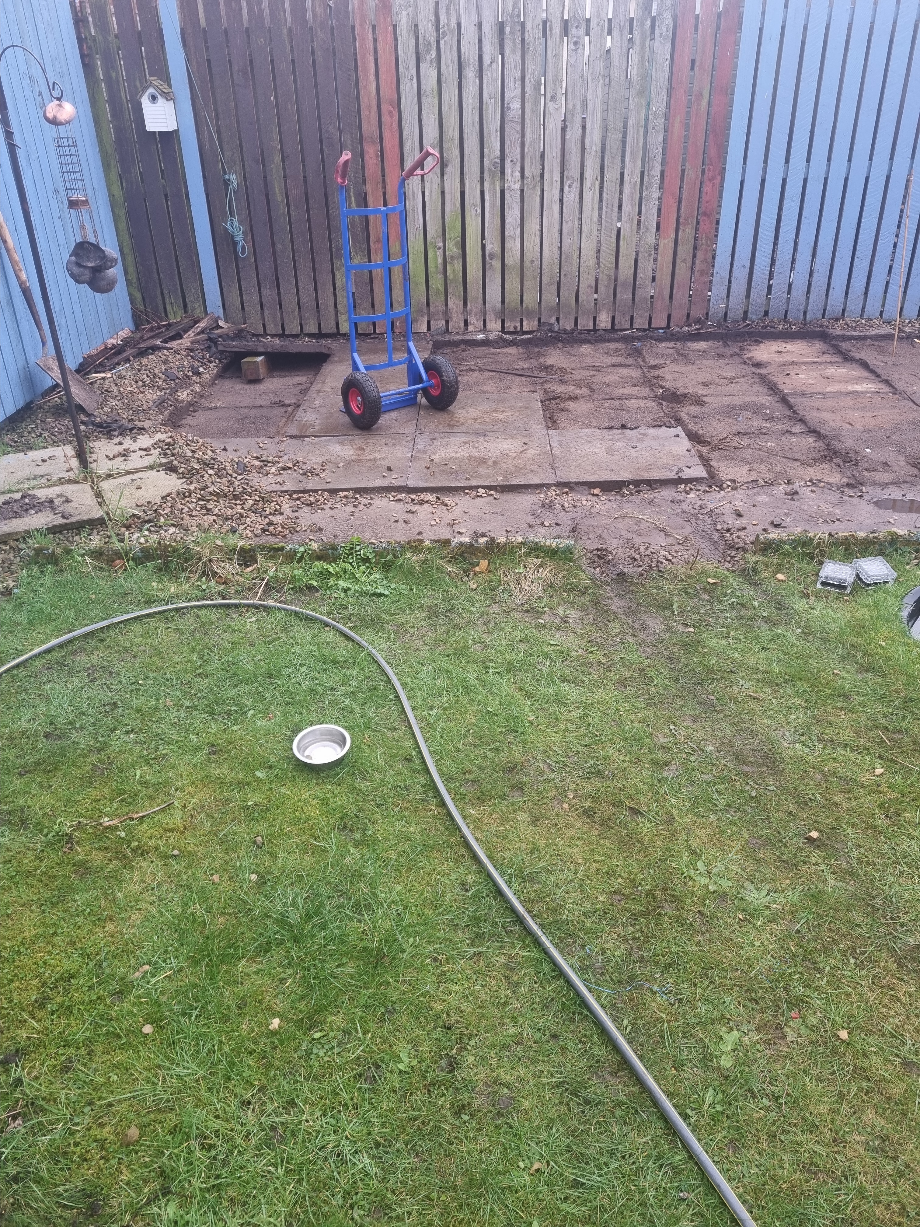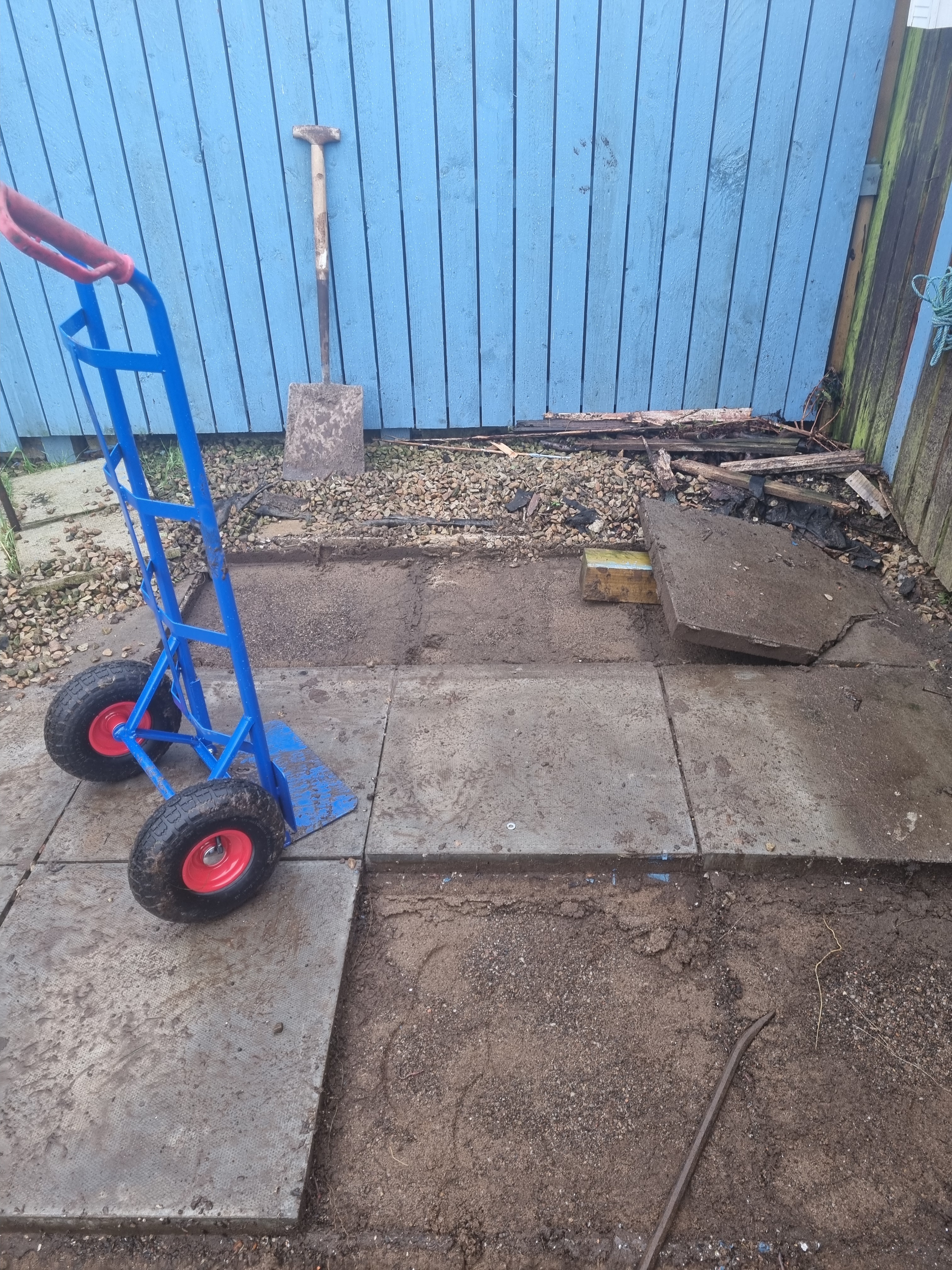Going to try and remove the 2x2 slabs and stack them on the driveway but damn, those things are heavy - about 45Kg each I think!! Waiting for Amazon to deliver a sack barrow which should make things easier. Meanwhile, I've broken up a line of slabs so that I can carry on and lay the cable duct...