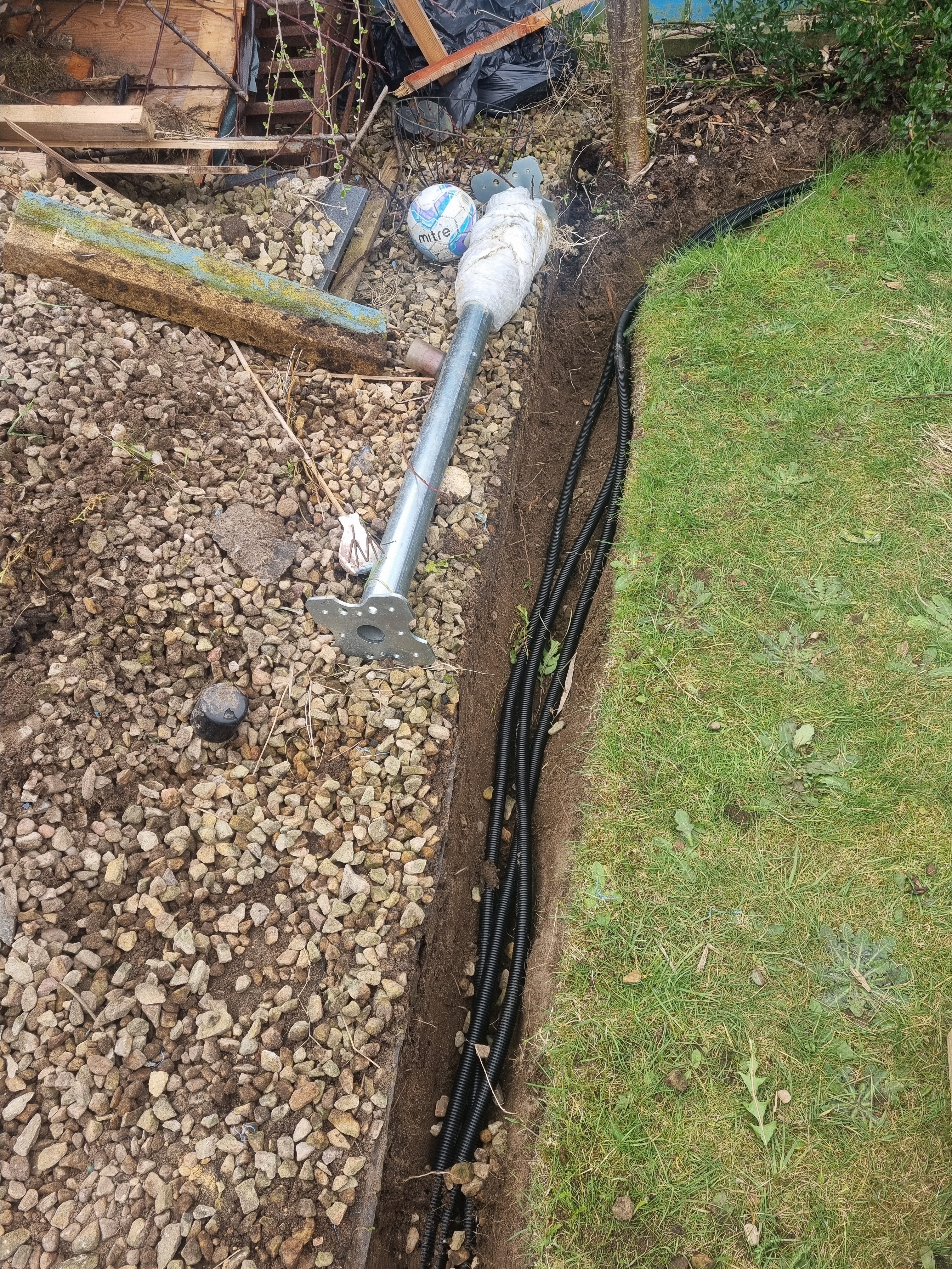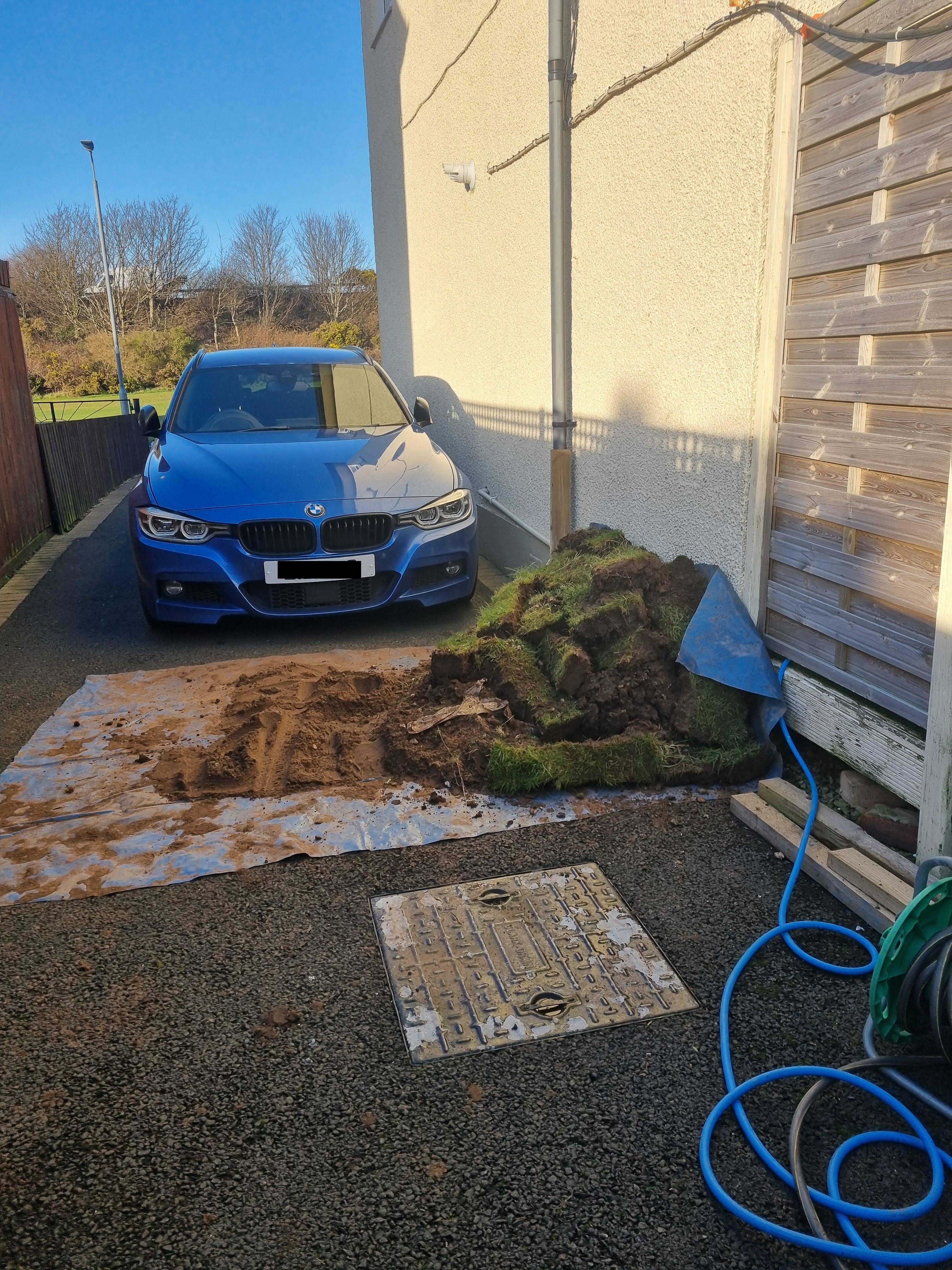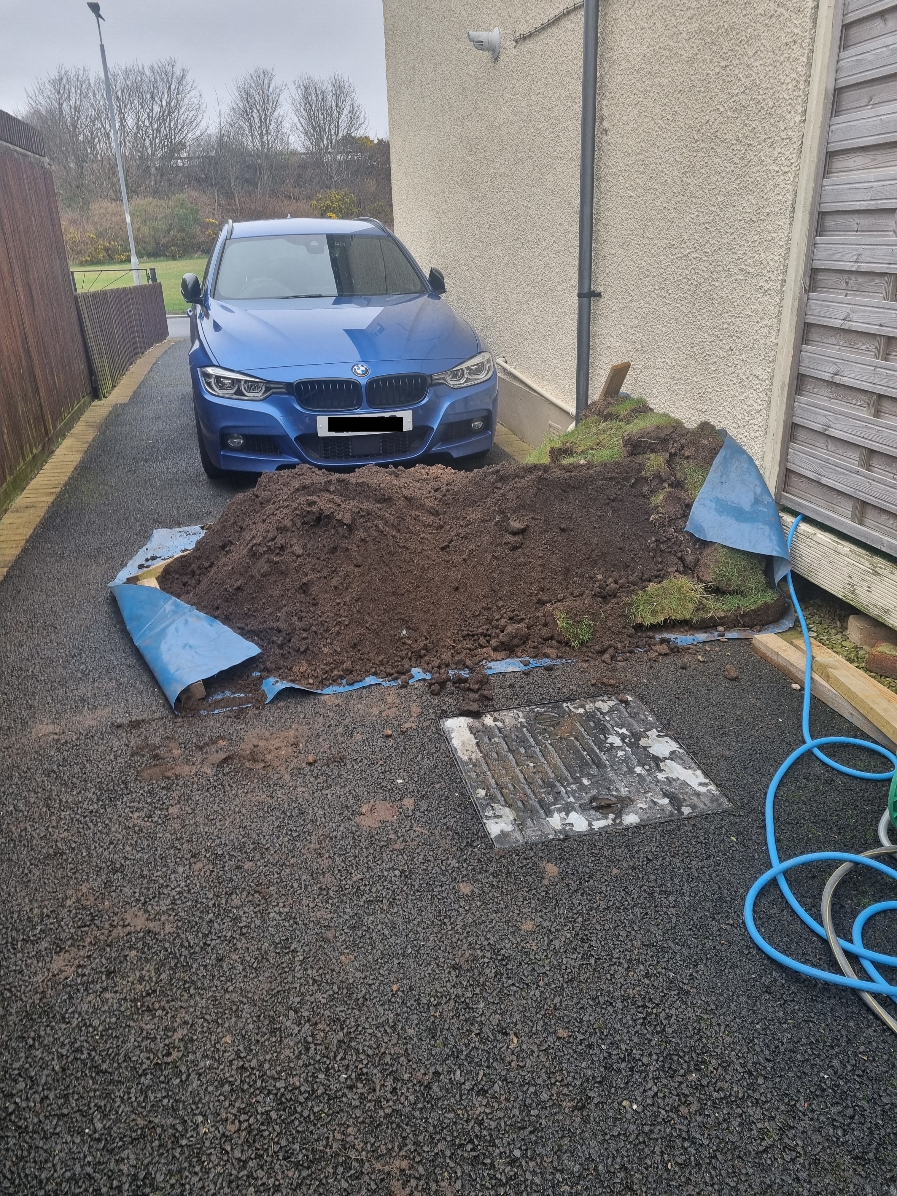 Going to try and remove the 2x2 slabs and stack them on the driveway but damn, those things are heavy - about 45Kg each I think!! Waiting for Amazon to deliver a sack barrow which should make things easier. Meanwhile, I've broken up a line of slabs so that I can carry on and lay the cable duct...