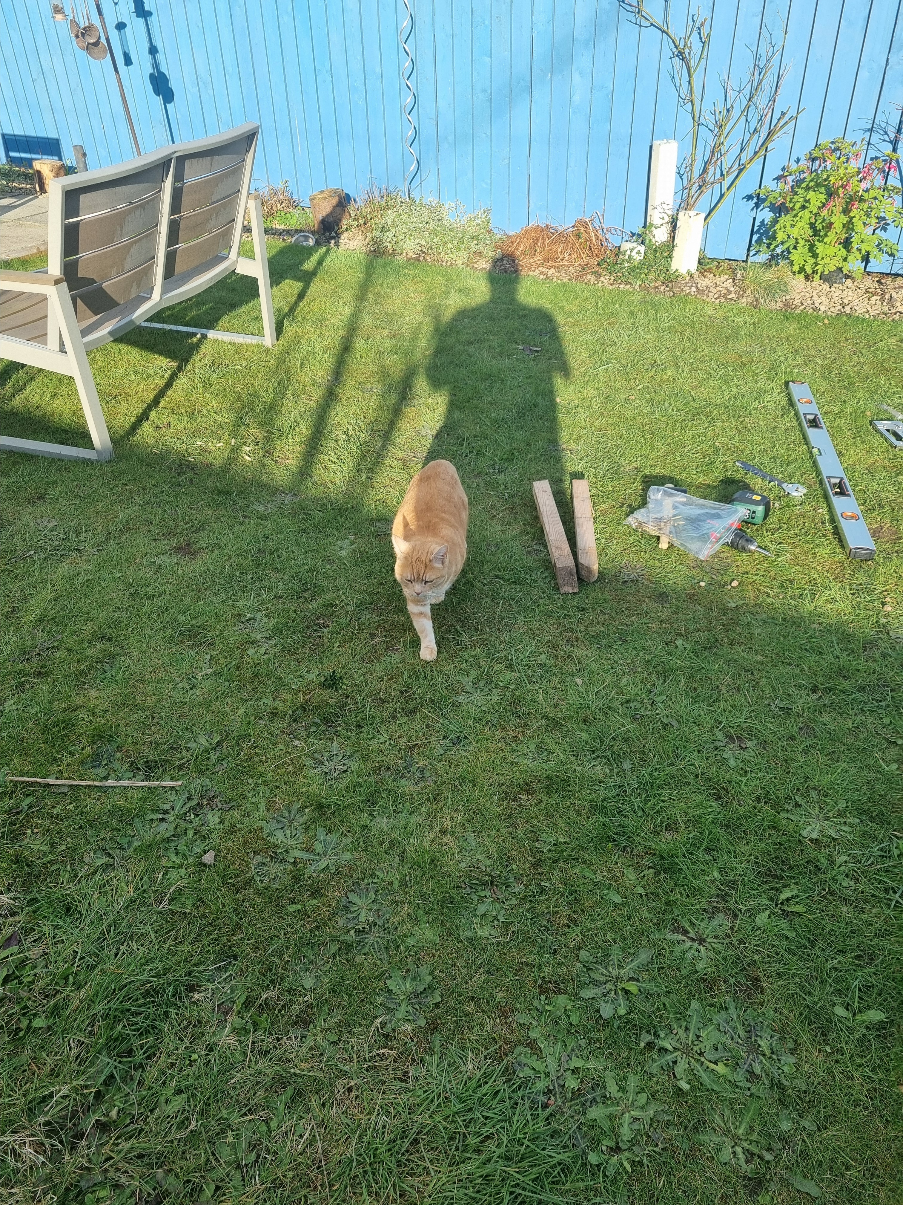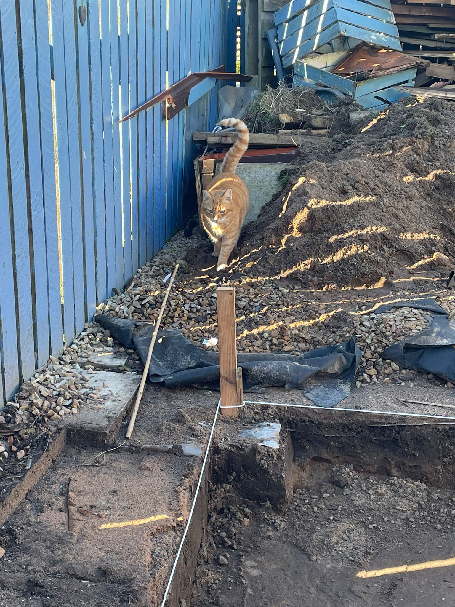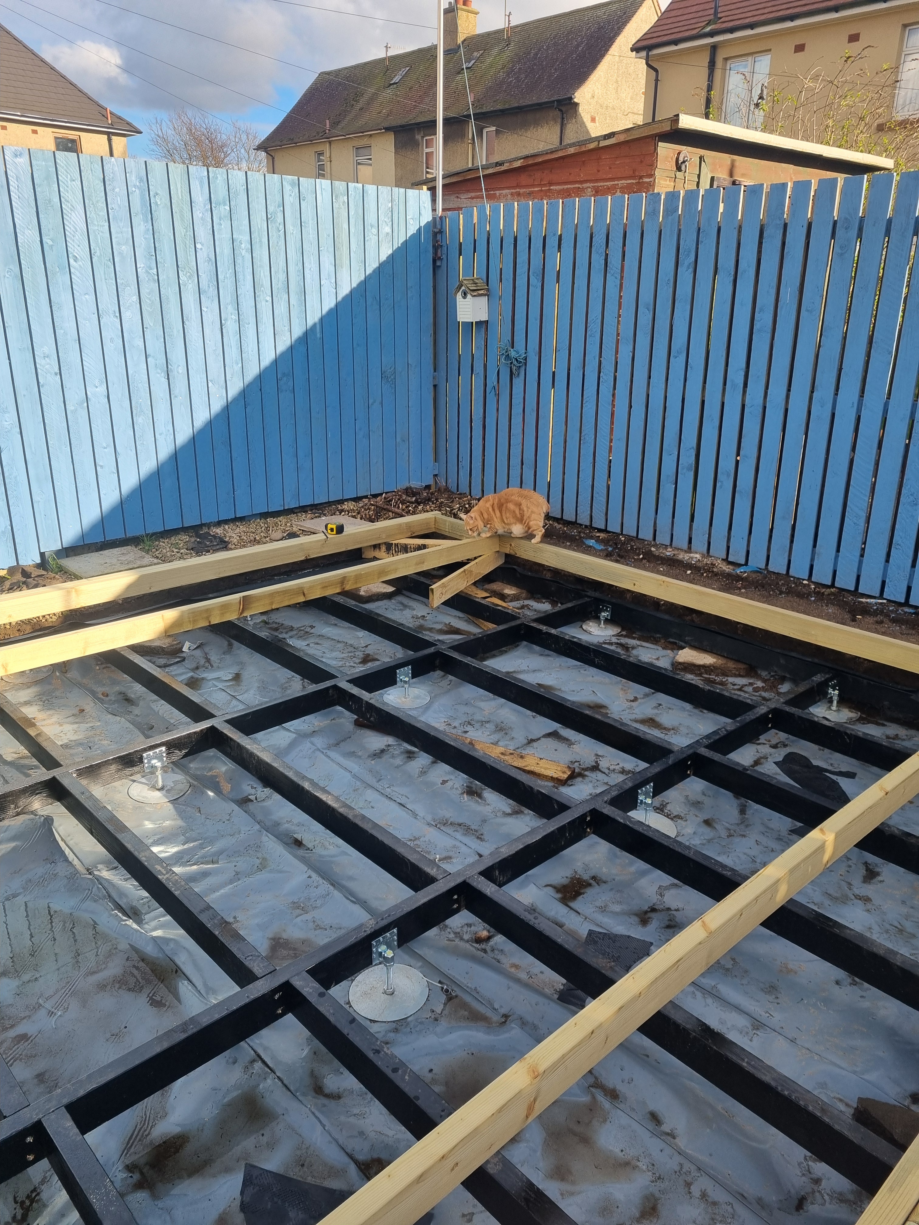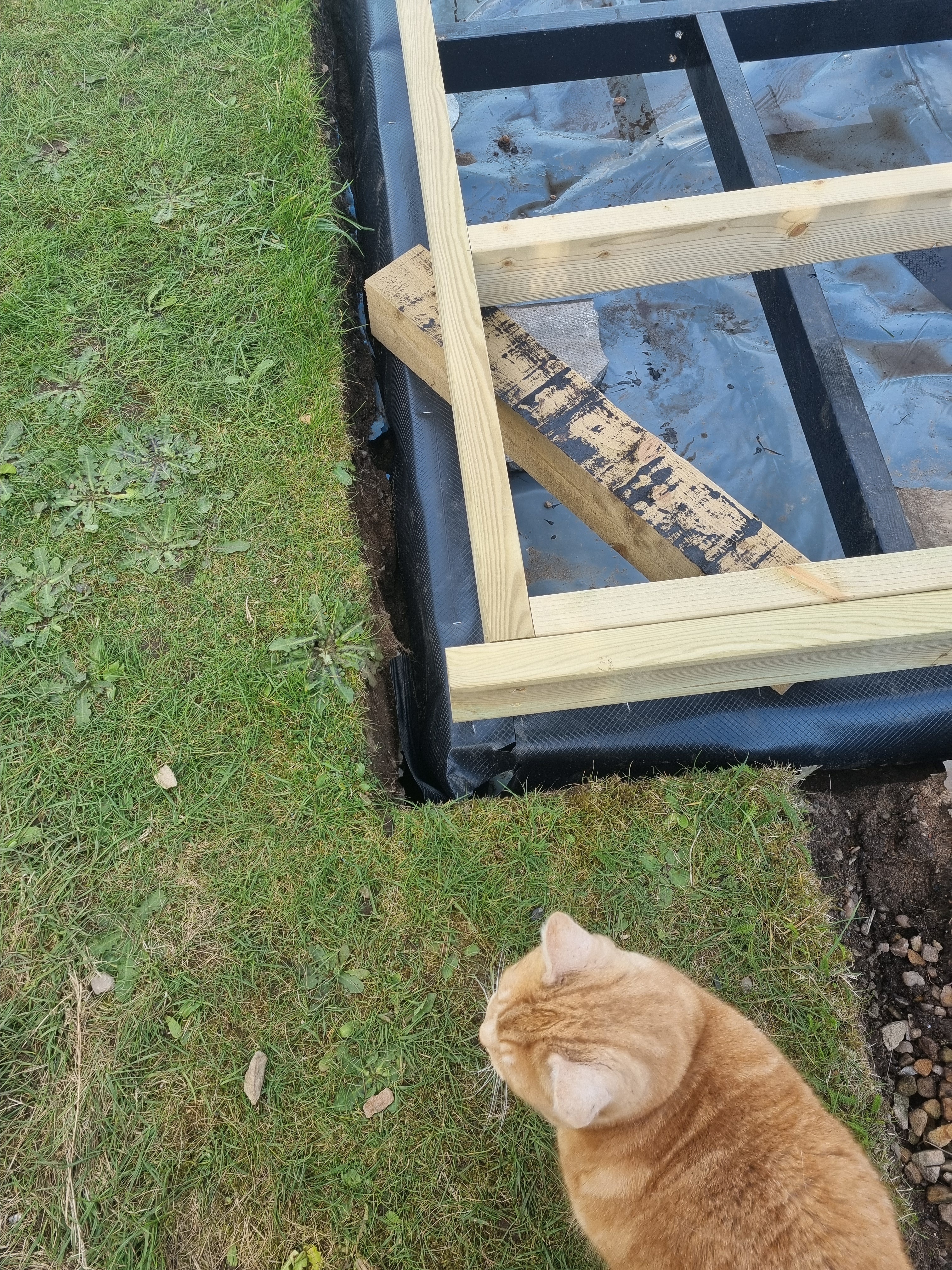 Floor frame build underway, studiously inspected by the other ubiquitous ginger cat...