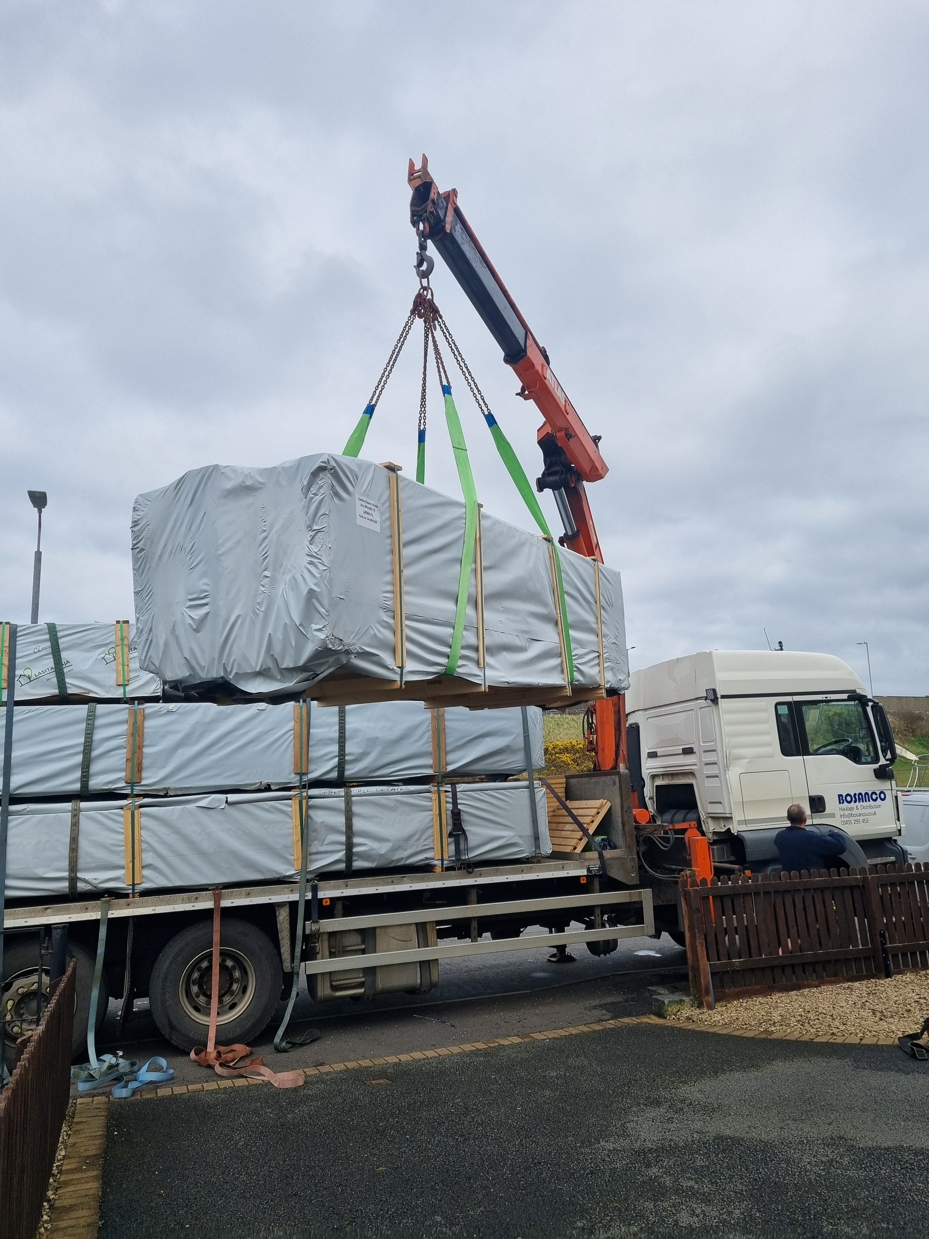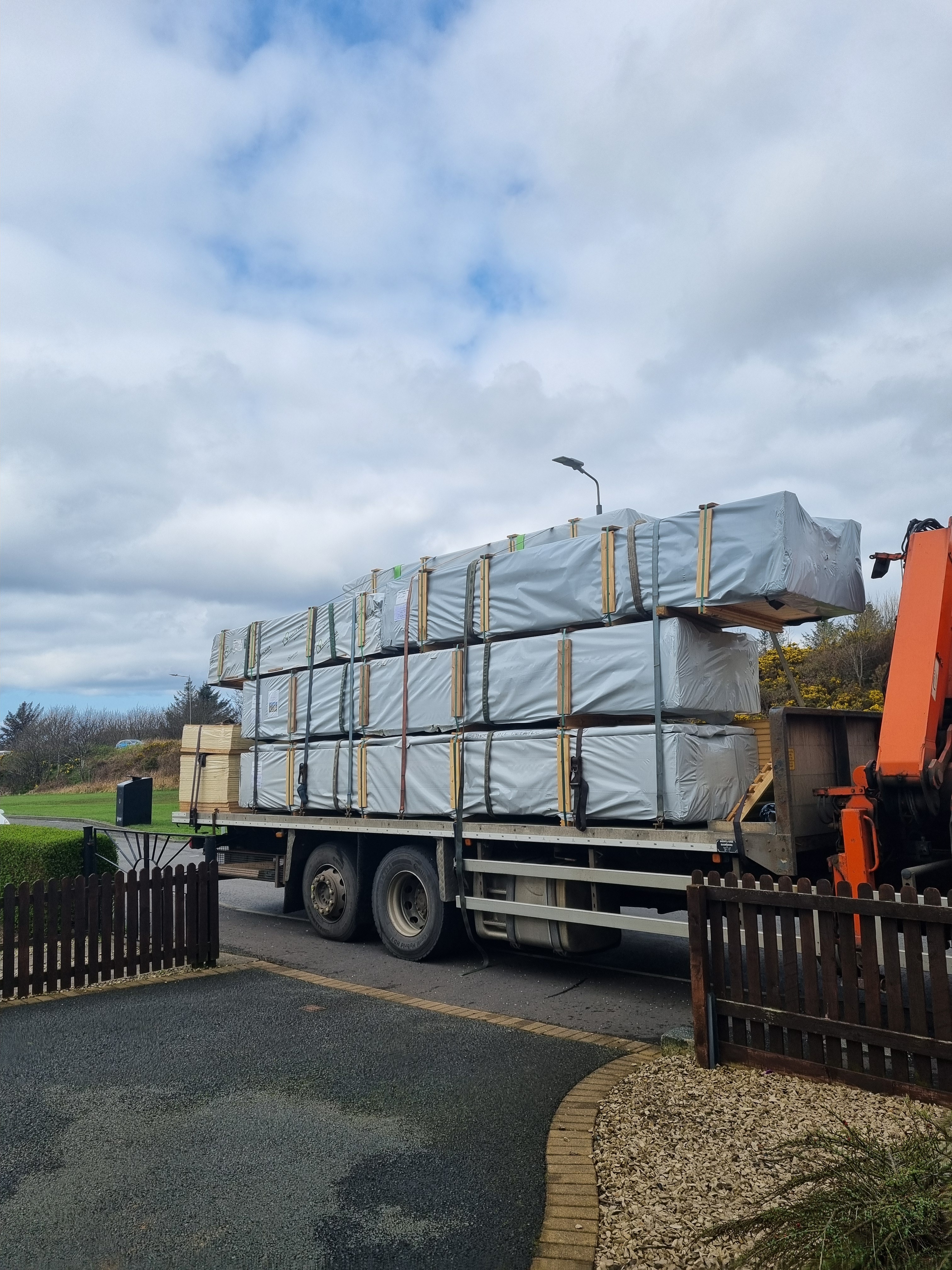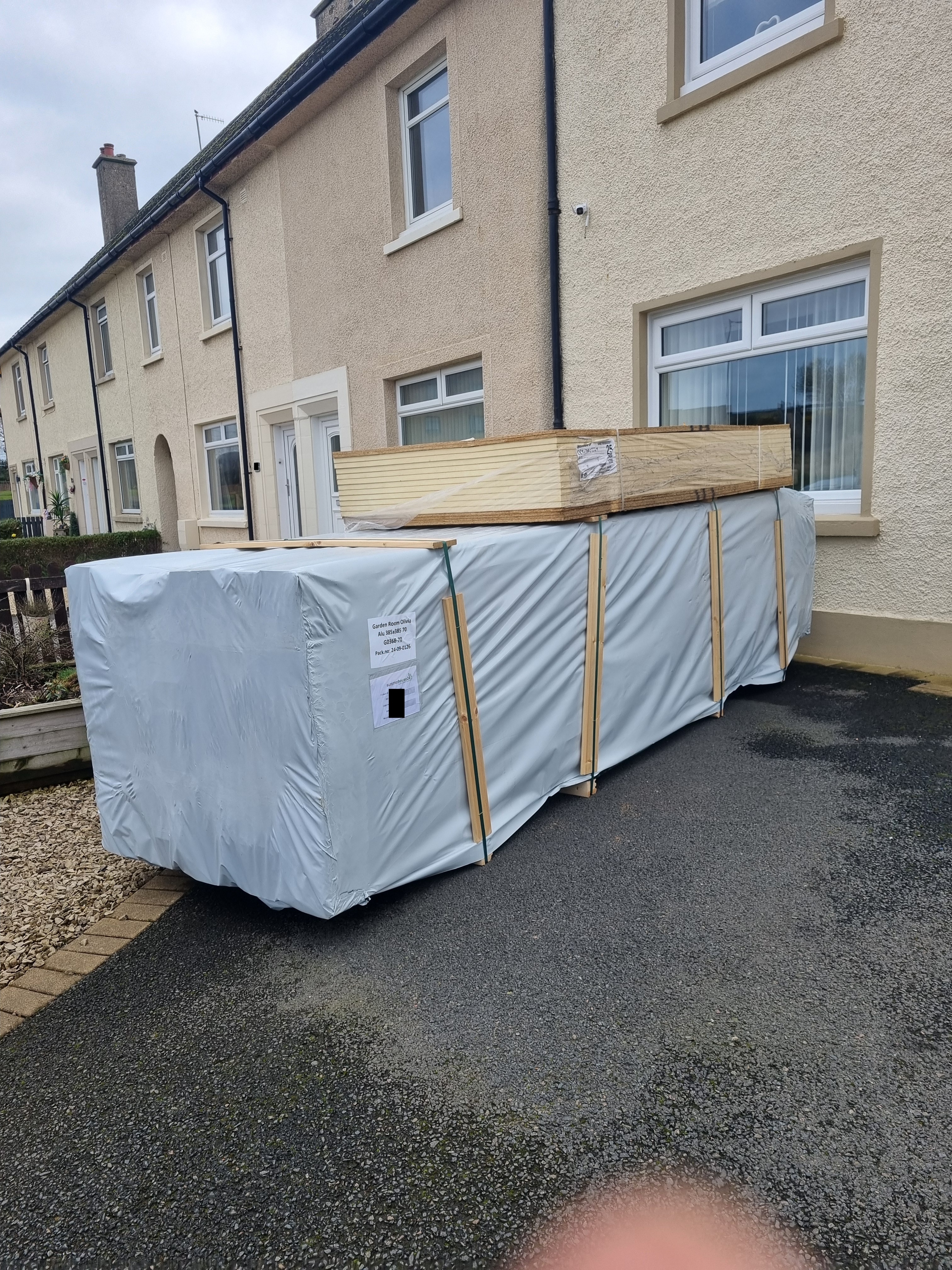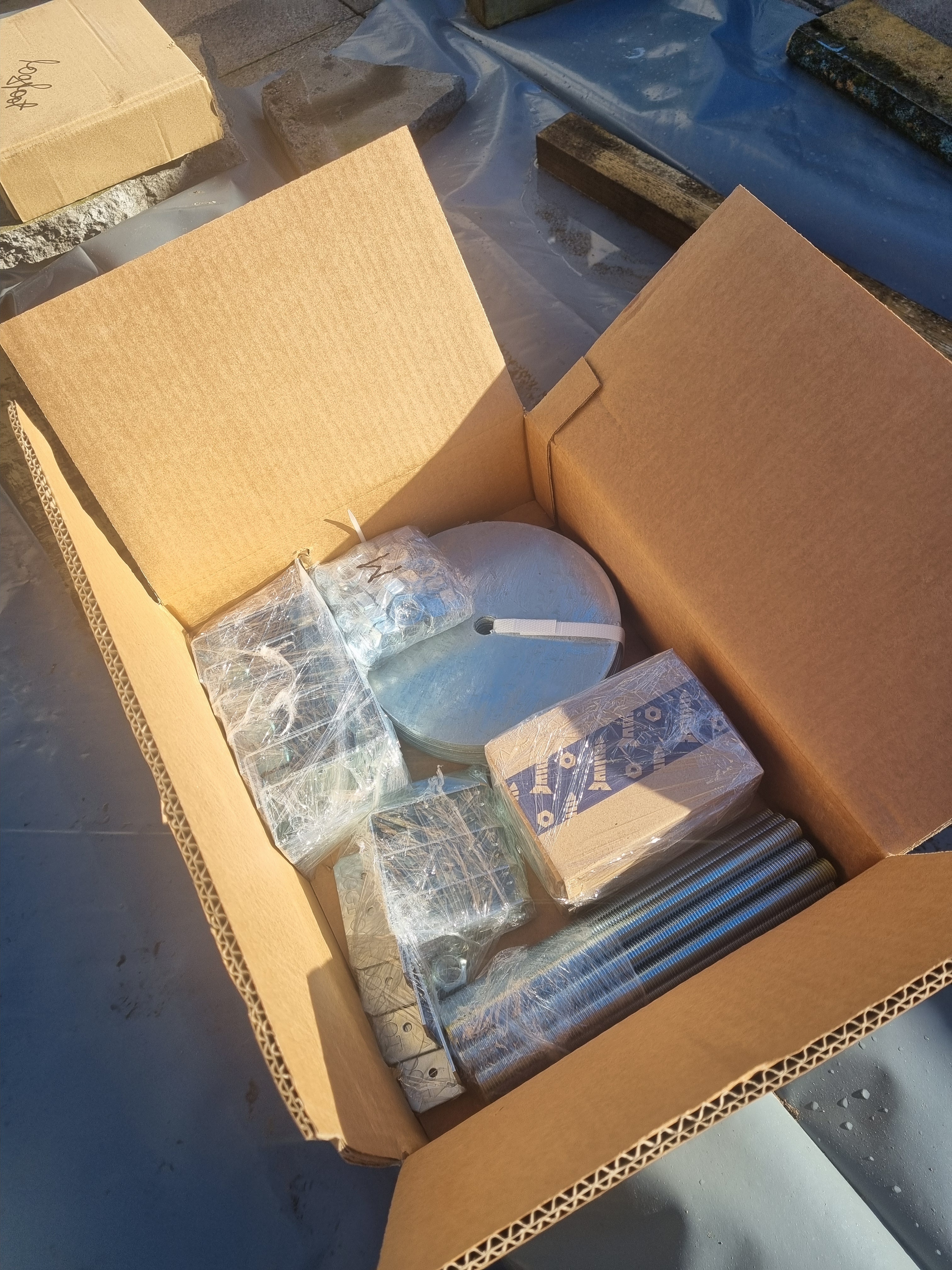 It's arrived and well within the 7-8 week estimation... now the proper work starts!! First job is to get the foundation beams out of the package and apply a bitumen coat before the weather closes in....