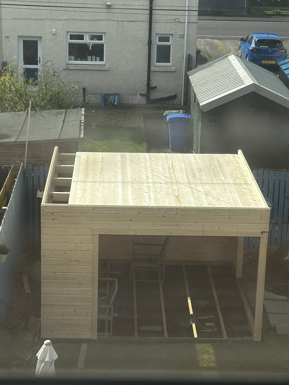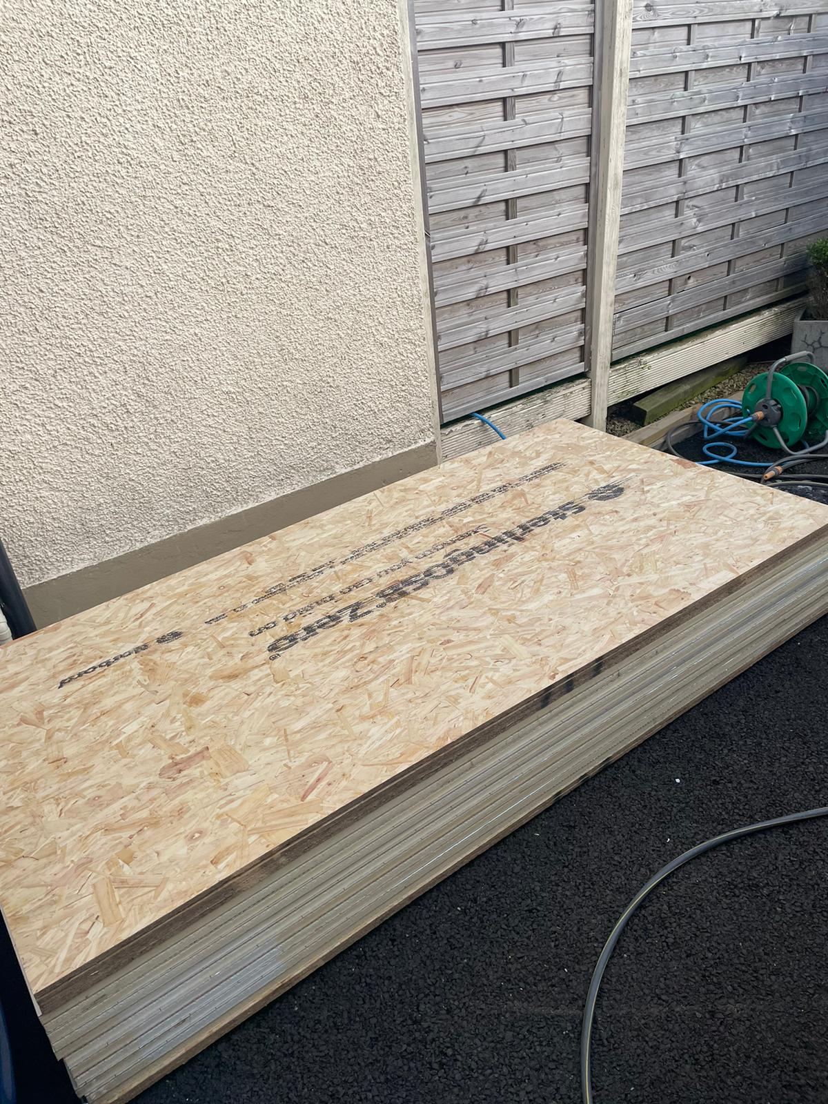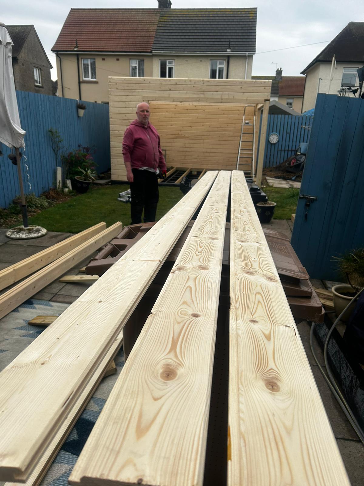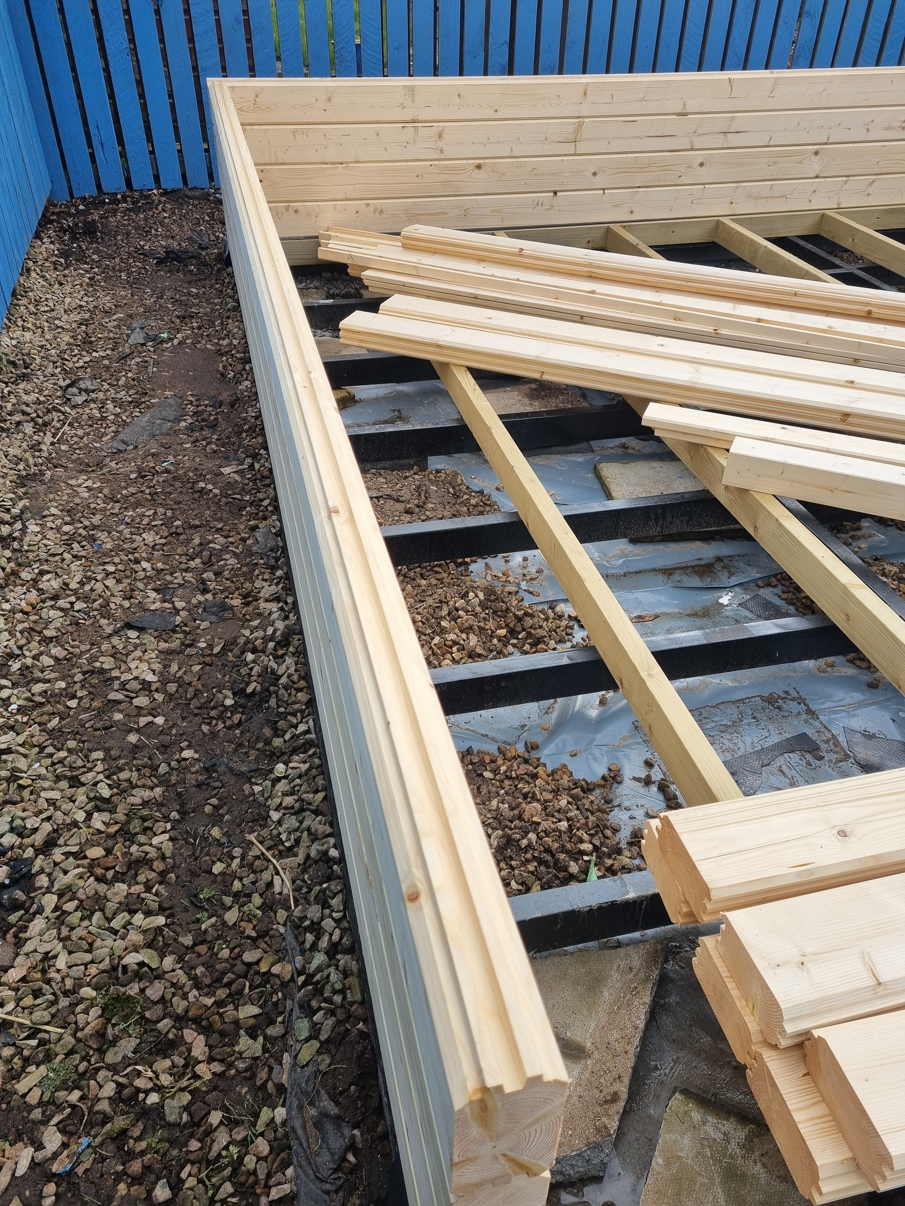 Better weather today so I've been able to use the power tools outside!! Final roof board cut and fitted, remaining timber moved in to the garden room to dry out...
